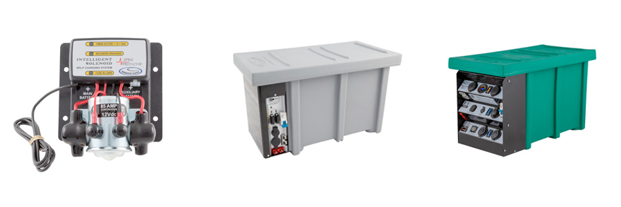 Both the Solenoid (Left) and DC-DC dual-battery systems are available in Power Pack form. The Grey Box (Middle) featuring the solenoid switch, while National Luna’s new Green Box (Right) offers a DC-DC charger with solar input.
