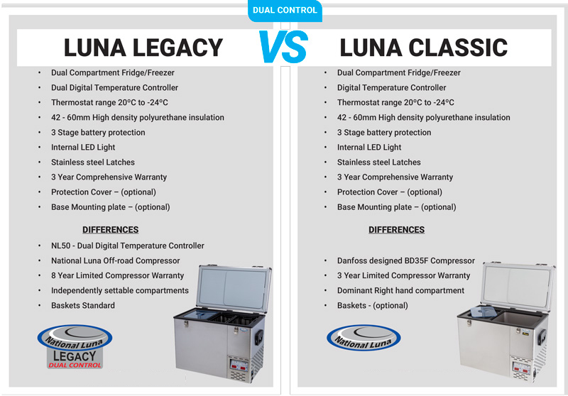 Following three decades of market experience and research, National Luna has noted that the 50-litre fridge size accounts for up to 60% of the portable-fridge market. This explains why their 50-litre Weekender unit is so popular worldwide. However, thanks to recent developments in valve technology, insulation, and compressor design, National Luna has now launched the first ever 50-litre dual-control fridge-freezer. It is the first of its kind worldwide and is available within the Legacy Range.