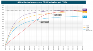 Die 105 A-diepsiklus-(natsel-)battery is dalk die eenheid in die dubbelbatterymark wat die beste verkoop, maar as ’n mens na hierdie grafiek kyk, kan jy sien dat die battery in baie gevalle nie die beste keuse is nie. Die grafiek wys die tipiese herlaaitye vir ’n 105 A-diepsiklusbattery by verskeie alternatorpunte. Hier is twee belangrike lesse te leer: