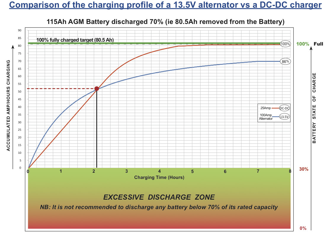 The above mentioned tests concluded that in certain instances, if your vehicle’s alternator output delivers a constant voltage of 13.9V or more, then a 20A to 25A DC-DC system will actually slow down the recharge process. In fact, above 13.9V, the solenoid system radically out performs (within the first few hours of driving) any 20A to 25A DC-DC charger on the market, regardless of what type of battery you use.