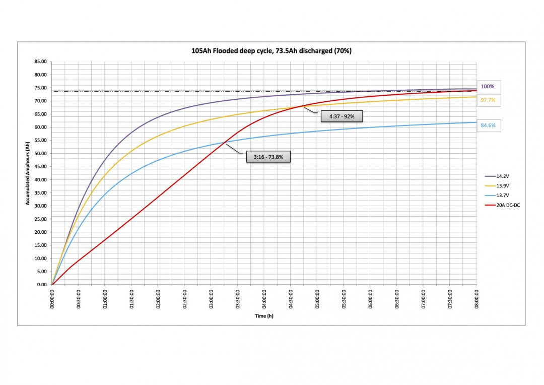 The graph shows typical recharge rates for a 105A deep cycle battery at various alternator outputs. There are two vitally important lessons to be learnt here…